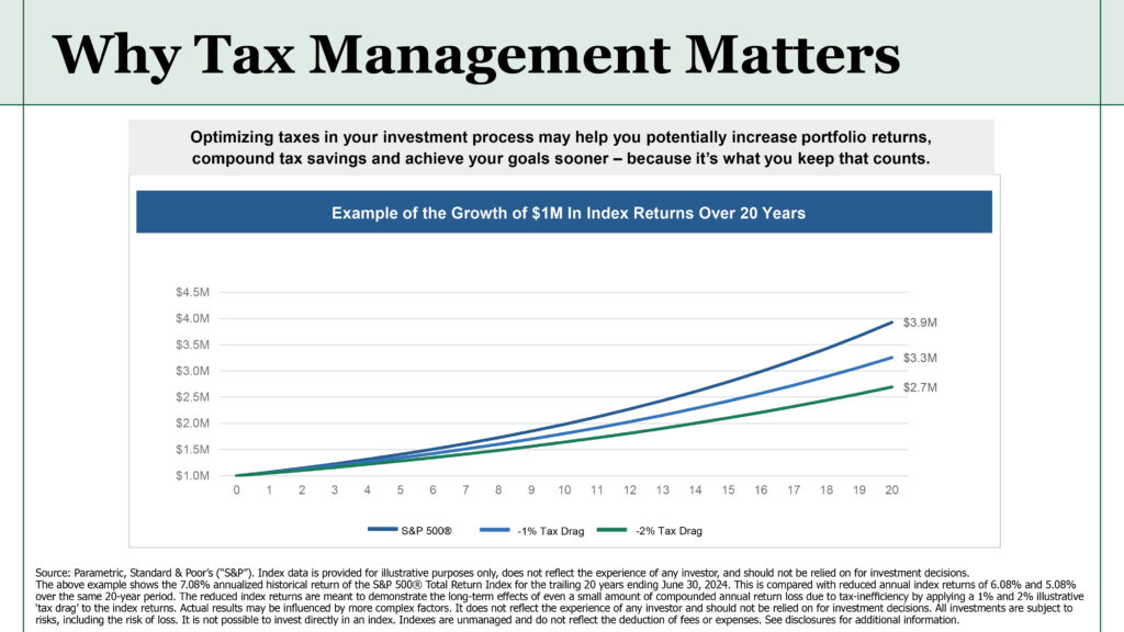 The difference between a portfolio with 1% annual tax drag and one with 2% may seem small, but it compounds into substantial wealth differences. Over 20 years, that single percentage point difference on a $1 million portfolio could creates over $500,000 in additional wealth.