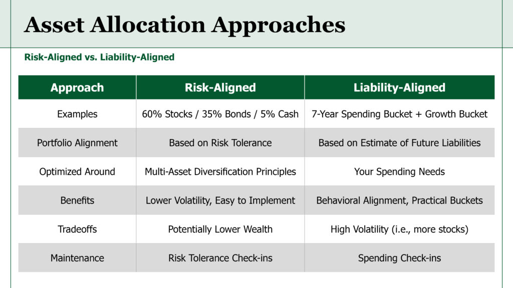 Investors can construct portfolios using a risk-aligned approach, traditional stock-bond ratios based on volatility tolerance, or a liability-aligned approach, bucketing assets based on spending timelines. Risk-aligned strategies work well for wealth accumulators seeking simplicity. Liability-aligned approaches suit those drawing income, providing psychological comfort by separating near-term spending needs from long-term growth assets.