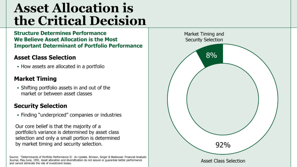 1 Source: “Determinants of Portfolio Performance II: An Update. Brinson, Singer & Beebower. Financial Analysts Journal, May-June, 1991. Asset allocation and diversification do not assure or guarantee better performance and cannot eliminate the risk of investment losses.