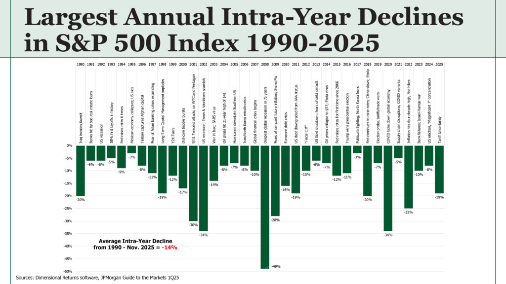 This pattern isn’t new. Since 1990, markets have experienced an average intra-year decline of 14%, yet three-quarters of these years still ended in positive territory. Understanding this historical context helps investors maintain composure when headlines generate anxiety.