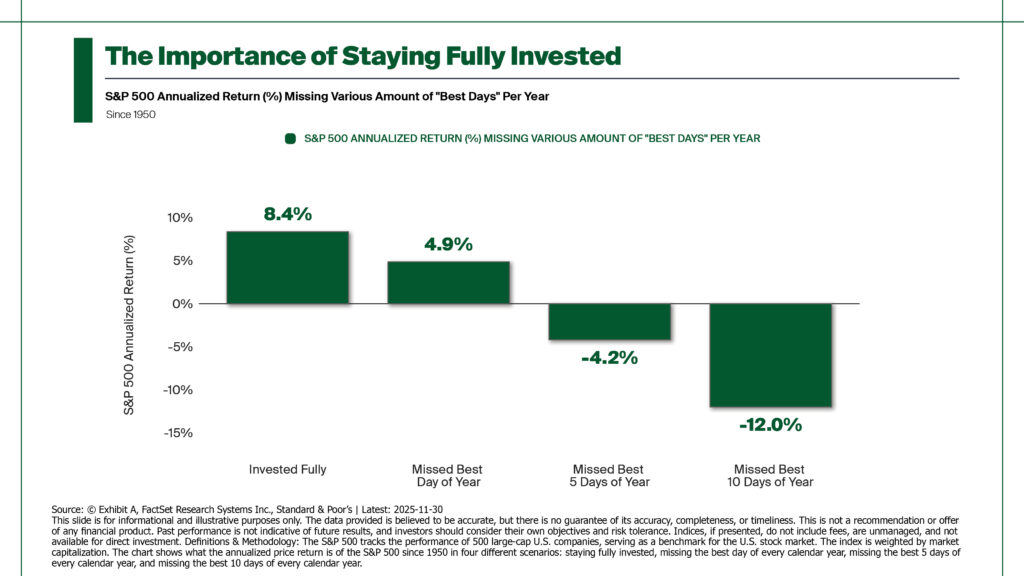 The best and worst market days tend to cluster together, making market timing nearly impossible. Missing just the single best day in 2025, April 9th when markets surged 9.5%, would have cut annual returns by more than half. Over longer periods, the math becomes even more stark: missing the 10 best days since 1950 turns positive returns into significant losses2